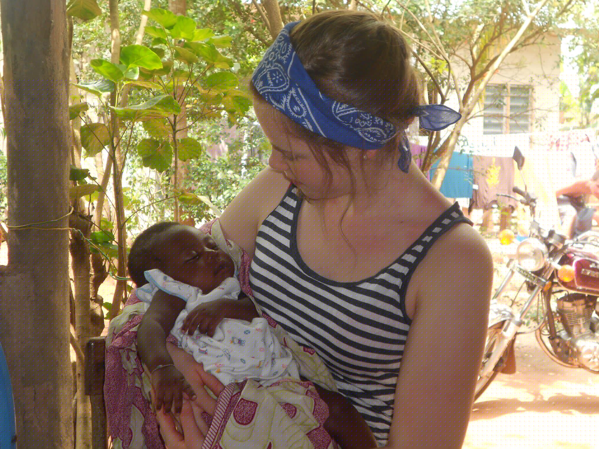 Pour les bonnes nouvelles, tout se passe très bien même si la vie n’est pas si simple : chaleur étouffante car climat très chaud et humide, très grande pauvreté donc puisqu’on est des «YOVHO» (= expression pour dire blancs en Afrique, on se fait harceler par tous les marchands qui nous disent: « YOVHO, bonjour, venez voir nos beaux produits, pas cher, pas cher !), difficile de refuser mais impossible de tout acheter comme ils le voudraient. Nos déplacements se font en «zem» (= motos qui sont partout dans les villes et villages, pas très rassurant mais trop cool quand même).