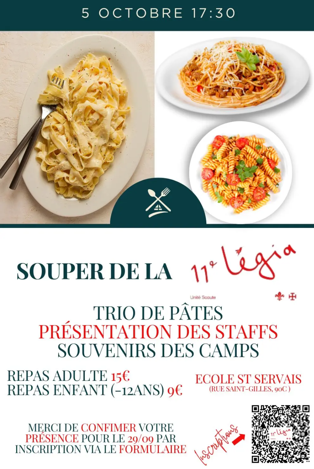 Le grand moment du début de l’année scoute se profile. Notre souper d’unité est prévu pour le samedi 5 octobre. Du changement, cette année : nouveau lieu (école Saint-Servais) et nouvelle formule (trio de pâtes) ! Mais toujours la même ambiance chaleureuse, le plaisir de se retrouver, la présentation des nouveaux staffs, les adieux émouvants aux anciens animateurs et, bien sûr, les montages-photos des camps 2024 !